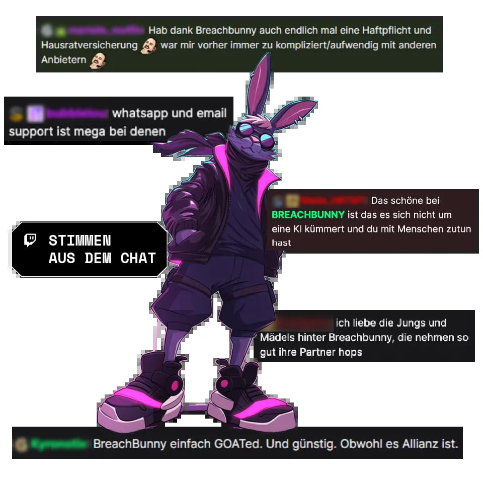 Unsere Versicherungsprodukte haben wir gemeinsam mit der Allianz entwickelt – einem der größten und ausgezeichnetsten Versicherer Europas. Du wirst von uns, BreachBunny, betreut – mit Support auf Medienkanälen auf denen du sowieso unterwegs bist. Aber im Hintergrund läuft das Ganze über die Allianz – das bedeutet: starker Support und echte Profis im Backup.